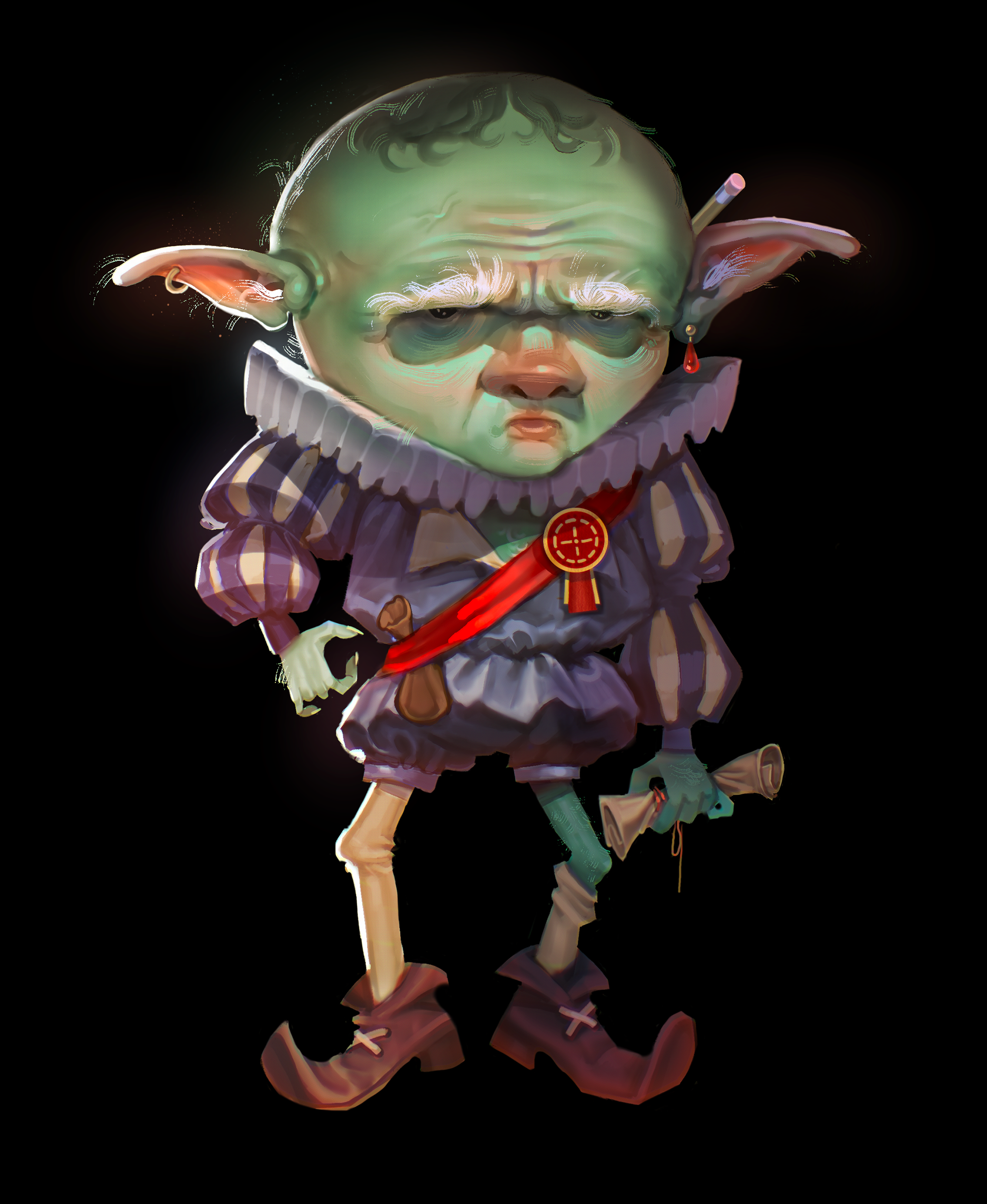 Gribble Slimeguise—Goblin, head of the fantasy Health & Safety Department, and an all around sleazy individual. He might give your tavern a passing grade in cleanliness... for the right price. Original character, Adobe PS.